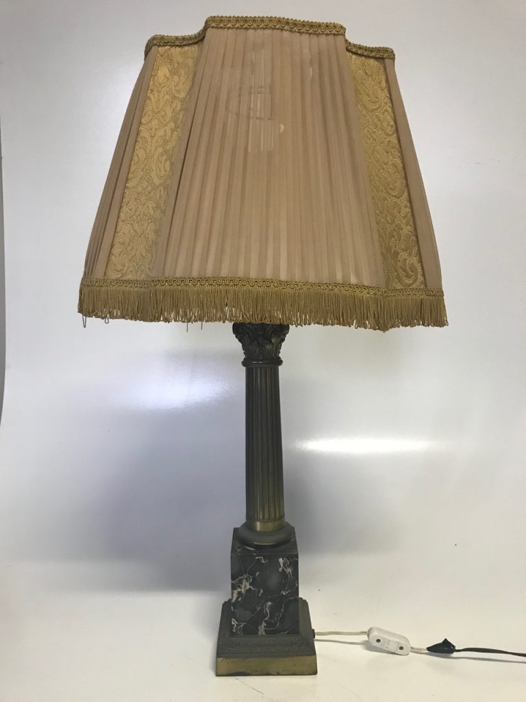 Artist/Content: Faded Glamour Regency Marble and Brass Table Lamp with Cut Corner Inverted Bell Shade