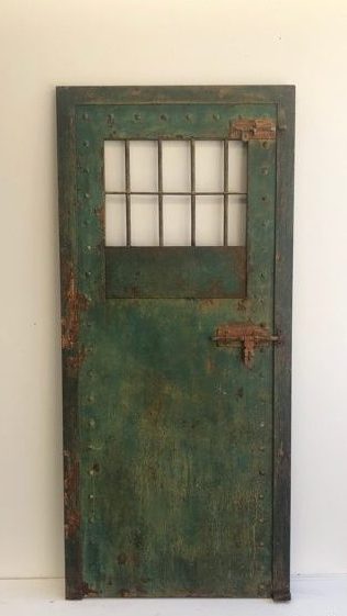 Green metal door with bars