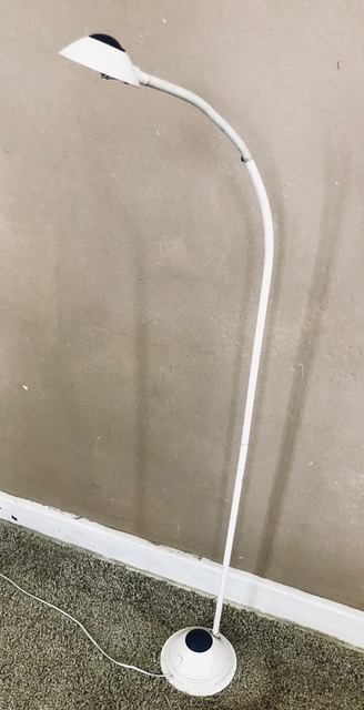 Artist/Content: White Gooseneck Adjustable Standing Lamp with Navy Dot Detail