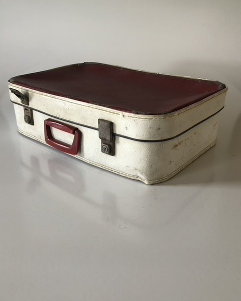 Artist/Content: White leather suitcase with maroon sides