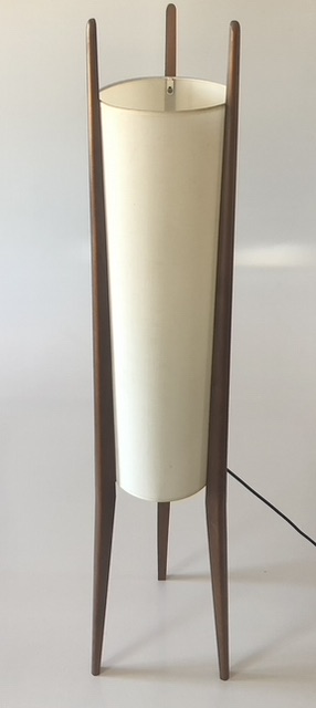 Artist/Content: Wooden tri-pod base with cylindrical beige lampshade