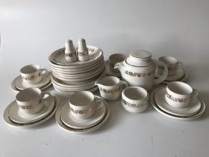 Description: 6 cups and saucers, milk jug, sugar bowl, teapot, salt and pepper shaker, 6 side plates, 6 bowls and 6 plates